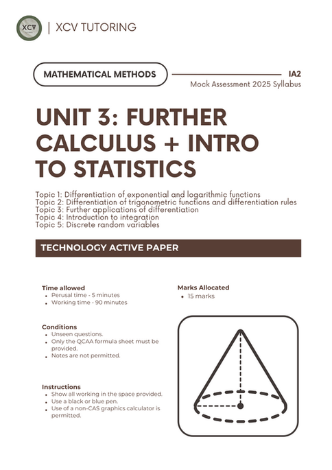XCV Tutoring is proud to present our first edition of our Mathematical Methods Unit 3 Practice Exam! Due to the varying nature of Internal Assessment, we have designed our examinations to provide students with an average to more difficult exam experience, to ensure this resource is useful to all students, and will leave them well prepared. The exam is based off the QCAA Mathematical Methods 2025 Syllabus, spanning the Unit 3 topics of: